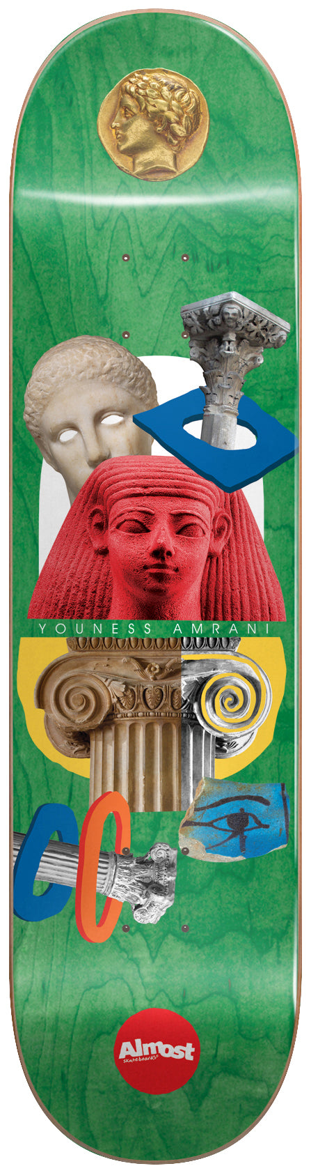 Designed by Almost Skateboards team rider Youness Amrani, this 8" green deck is made with durable materials for long-lasting performance. Perfect for street skating, this deck features a unique design and size that provides precise control and stability for any trick. Upgrade your skate game with the Almost Youness Amrani Relics deck.