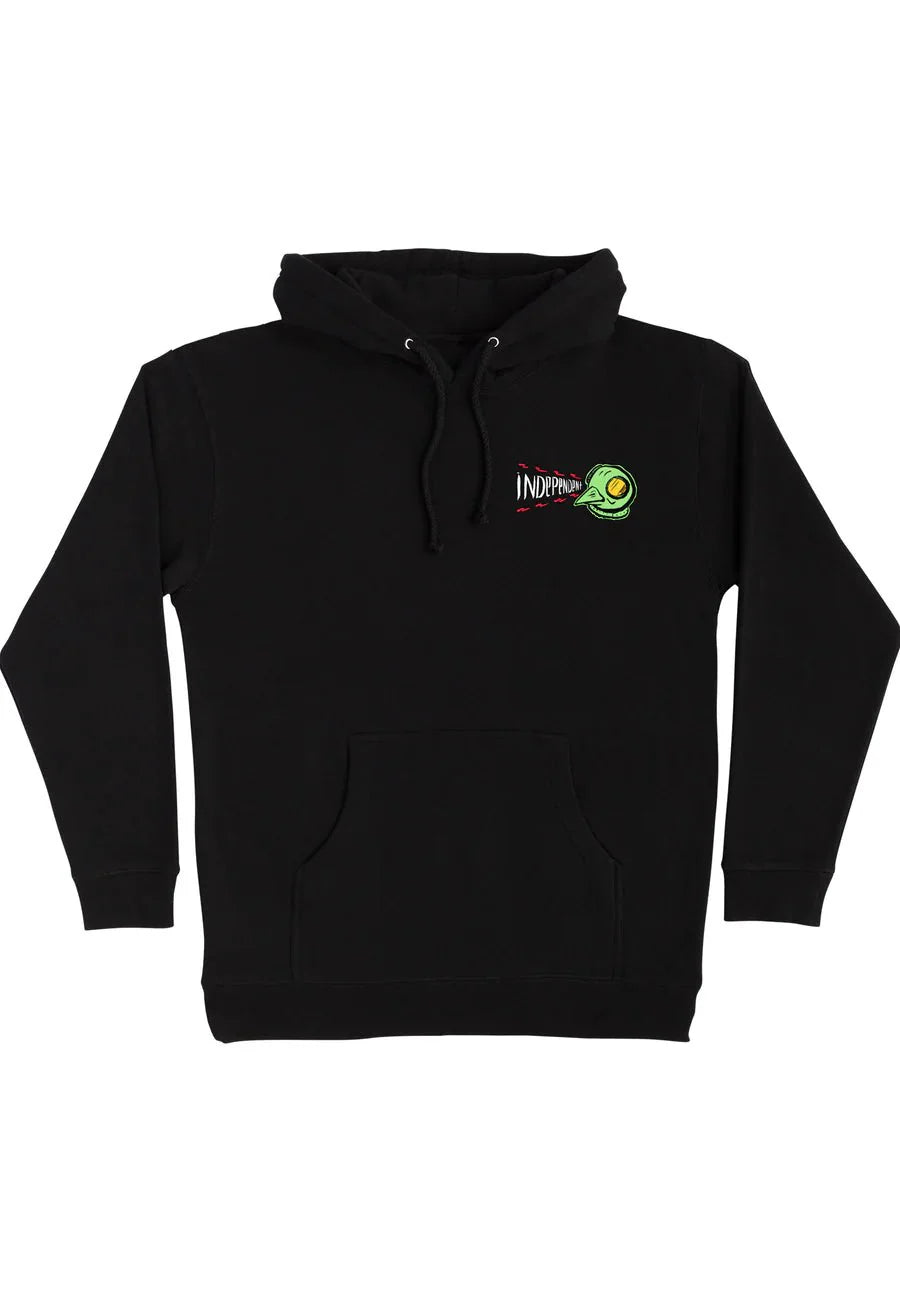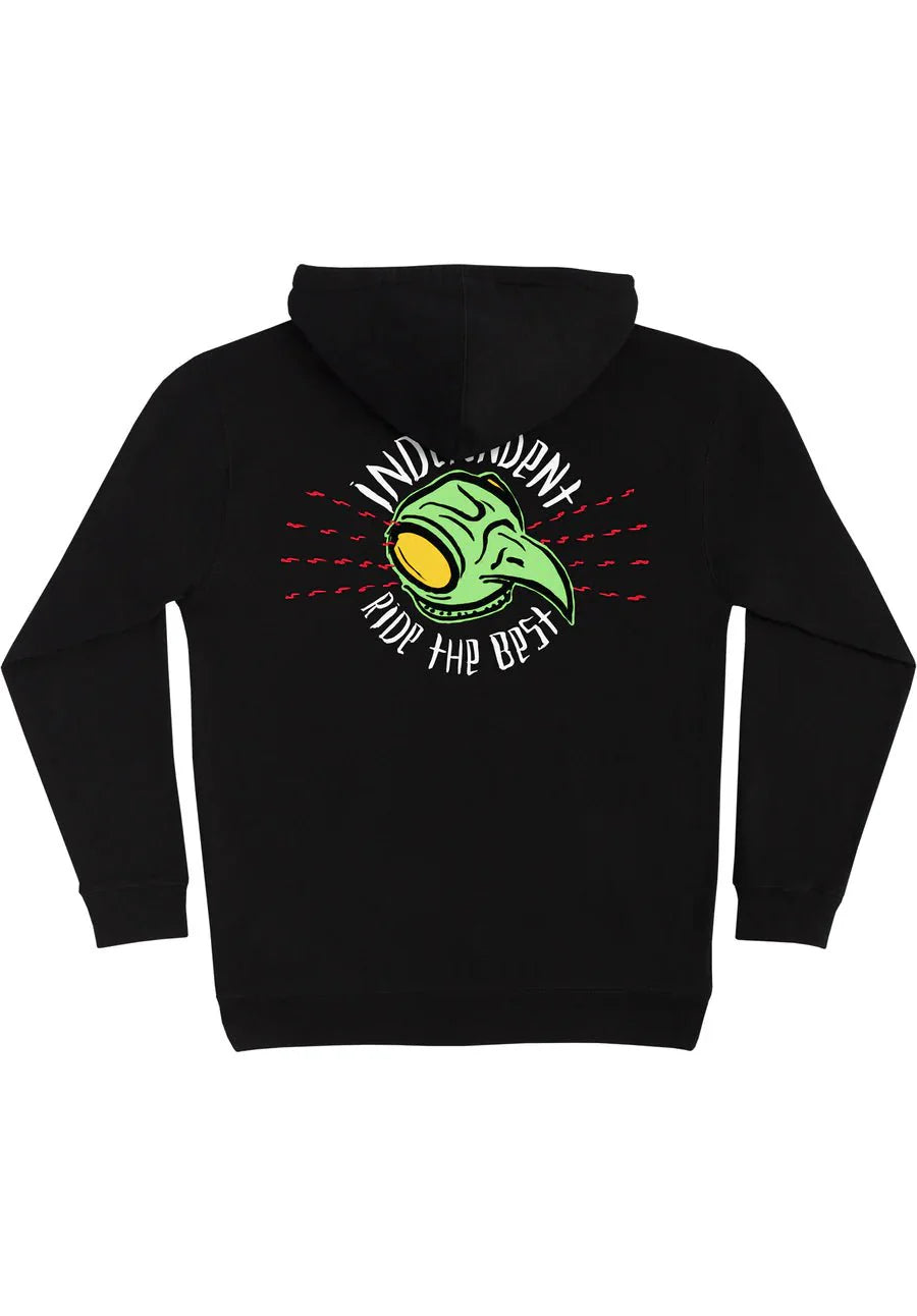 Independent Trucks proudly releases the Tony Hawk Transmission collection. This legendary collaboration features glow-in-the-dark artwork created for Tony Hawk by famous Devo frontman, Mark Mothersbaugh. The new Hawk Transmission men's midweight pullover hooded sweatshirt features small chest, large back and interior hood Hawk Transmission prints in glow-in-the-dark soft hand ink. Skateboarding's greatest icon rides the best. Independent Trucks - Built to Grind.